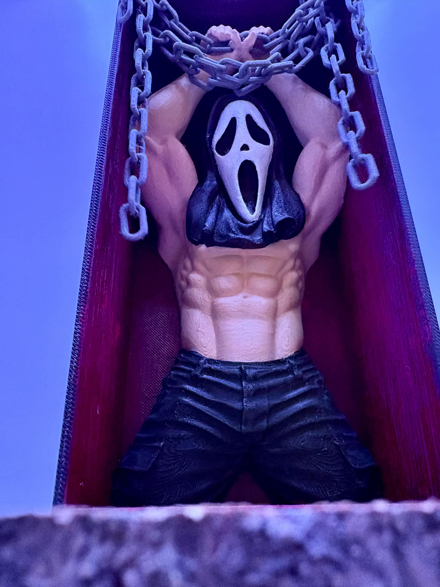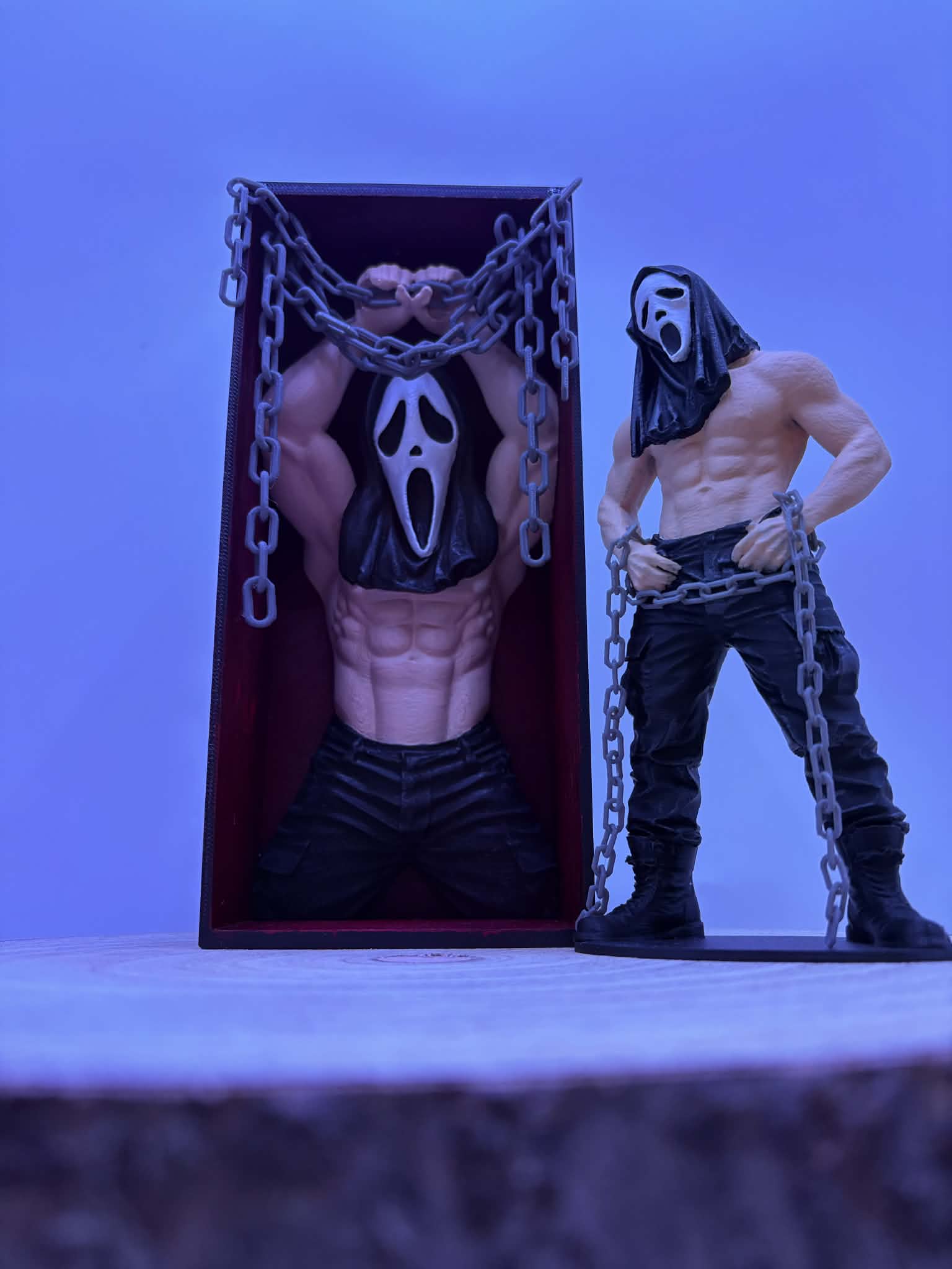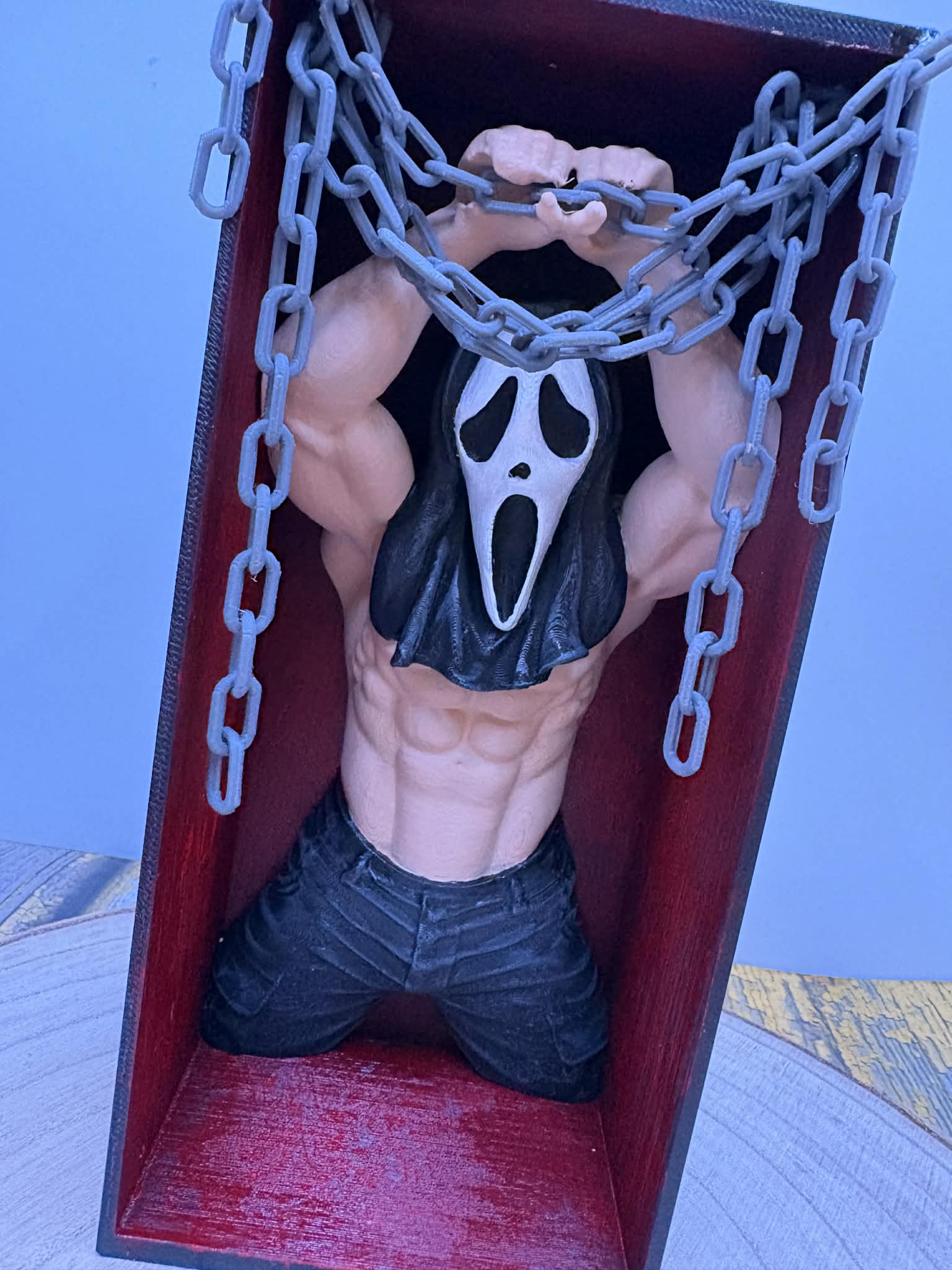 Ez a Ghostface ihlette könyvtámasz a dark romance világának esszenciáját hozza el: sötét, intenzív és ellenállhatatlanul vonzó. A koporsóba zárt, láncokkal megkötözött alak nem a félelmet, hanem a feszültséget és a tiltott vágyat idézi meg.